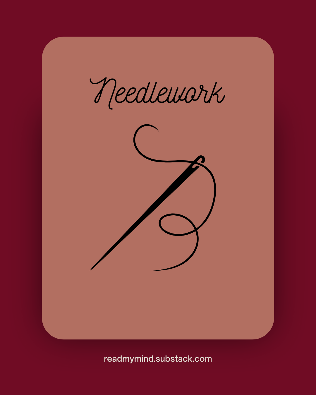 My earliest memory of threading a needle is when I was really young, probably before I turned ten. My friend’s mum had a hair salon, a humid, bustling place thick with the scent of ‘soul-mate’ and ‘pink oil’, and when we hung out there, we’d always volunteer to help with the small tasks like threading the needles. It was a serious, almost surgical task, eyes narrowed, tongue pressed between teeth, coaxing the limp, severed end of the cotton through the tiny, metallic eye.